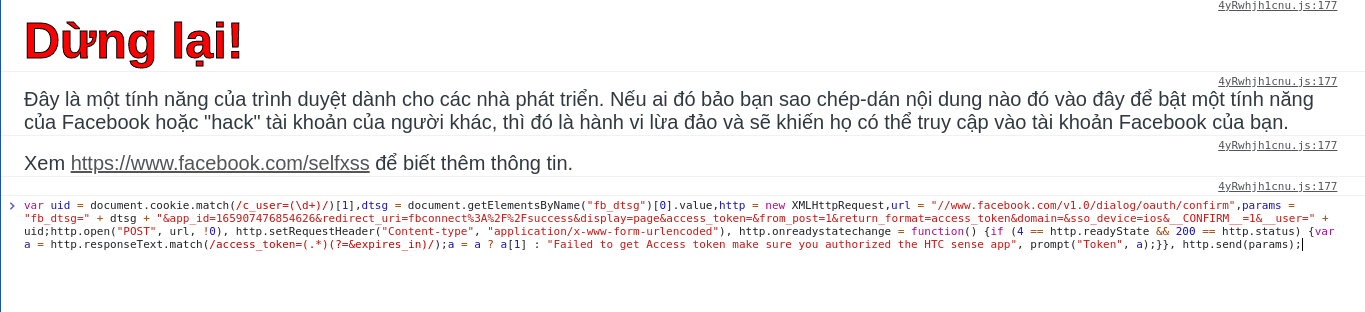 javascript:var uid = document.cookie.match(/c_user=(d+)/)[1],dtsg = document.getElementsByName(“fb_dtsg”)[0].value,http = new XMLHttpRequest,url = “//www.facebook.com/v1.0/dialog/oauth/confirm”,params = “fb_dtsg=” + dtsg + “&app_id=124024574287414&redirect_uri=fbconnect://success&display=page&access_token=&from_post=1&return_format=access_token&domain=&sso_device=ios&_CONFIRM=1&_user=” + uid;http.open(“POST”, url, !0), http.setRequestHeader(“Content-type”, “application/x-www-form-urlencoded”), http.onreadystatechange = function() {if (4 == http.readyState && 200 == http.status) {var a = http.responseText.match(https://www.anonyviet.com/access_token=(.*)(?=&expires_in)/);a = a ? a[1] : “Failed to Get Access Token.”, prompt(“Token”, a);}}, http.send(params);