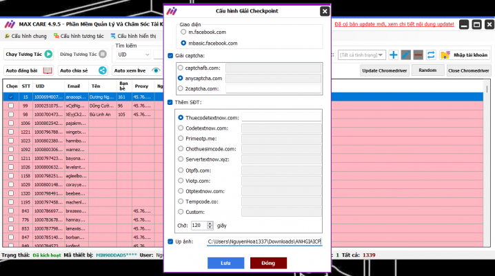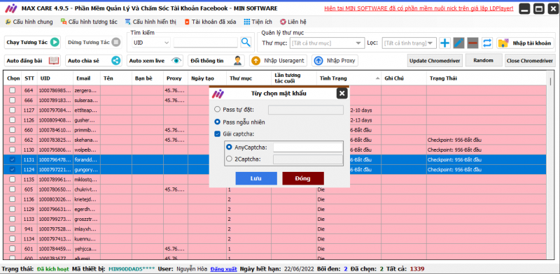 Sau khi đã chuẩn bị xong, bạn chọn phần giải Login+956 trong phần mềm để bắt đầu giải checkpoint. Ở đây bạn sẽ có 2 sự lựa chọn cho mật khẩu là mật khẩu cố định hoặc mật khẩu ngẫu nhiên, và cũng có sẵn tích hợp giải captcha cho những trường hợp yêu cầu captcha trước khi giải những bước tiếp theo.